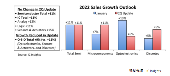 近日,市调机构IC Insights更新了本季度的《麦克林报告2022》。报告显示,今年微处理器和功率分立器件的收益更高,但在全球经济面临更大风险的情况下,光电子产品的销售额增长放缓。