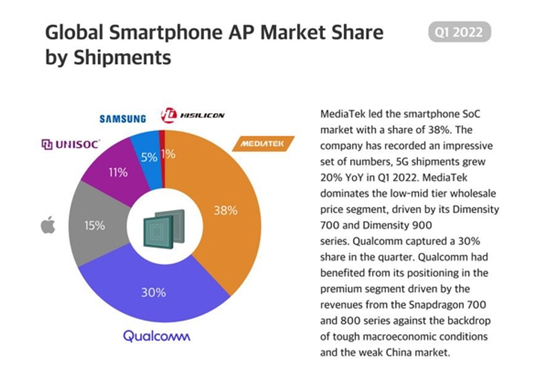 按出货量统计:一季度全球智能手机AP市场联发科以38%的份额引领智能手机SoC市场,2022年第一季度5G芯片出货量同比增长20%;联发科在其天玑700和天玑900系列的推动下,在中低端批发价格领域占据主导地位。