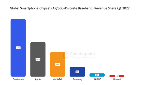 据市调机构Counterpoint报告显示,2022年第一季度全球智能手机芯片收入最高的是高通,出货量最高的是联发科。