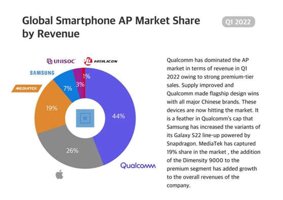 按营收统计:由于高端销售强劲,高通在2022年第一季度的收入方面以44%的份额主导了AP市场,而联发科只有19%的市场份额,主要凭借天玑9000为整体收入赢得了增长。随着供应得到改善,高通在所有主要中国品牌中赢得了旗舰机型的青睐。这些设备现在正在进入市场。此外,三星增加了搭载骁龙芯片的Galaxy S22系列型号(欧版S22系列部分使用的是三星的自研芯片),这也是高通公司的一大亮点。