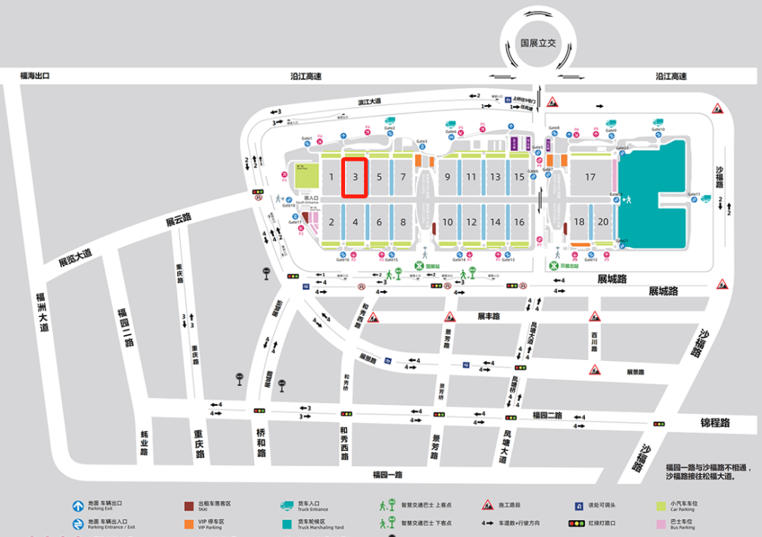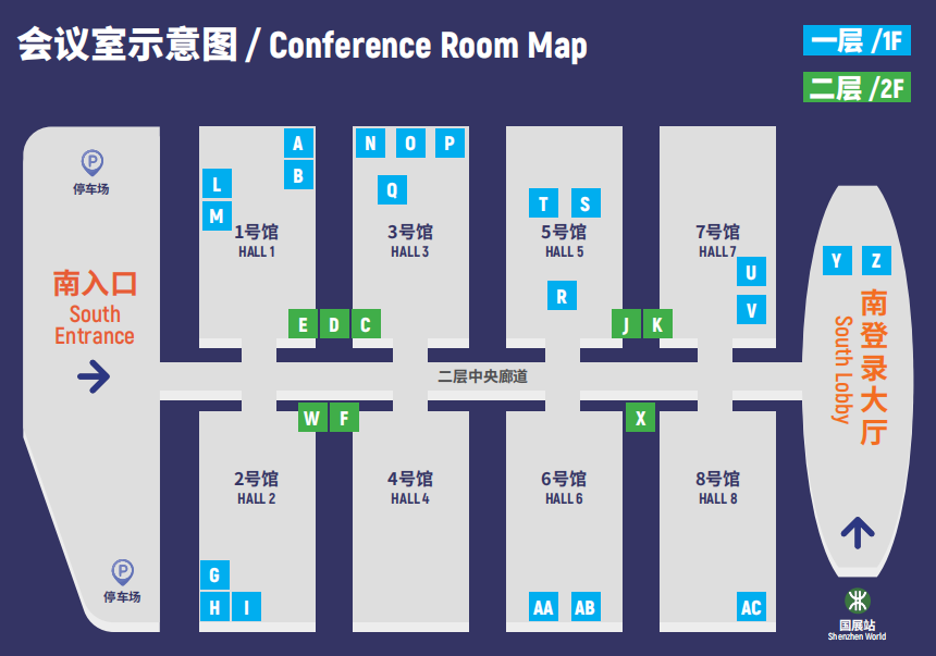 2)沿江高速S3(国际会展中心出口),经由国展立交-凤塘大道-滨江大道从展城路从P1停车口入;停好车后根据指引从C区电梯上南登陆大厅;