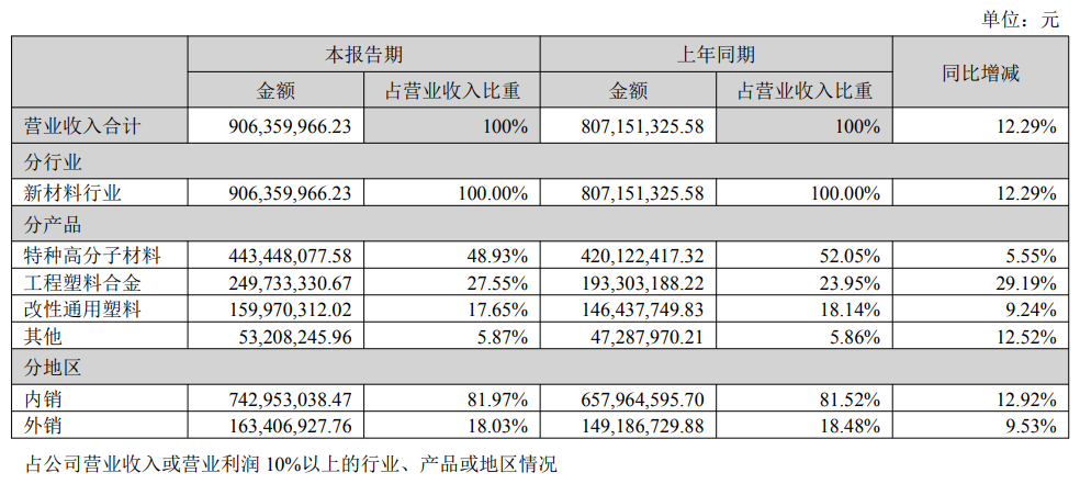 分产品看,报告期内,沃特股份特种高分子材料、工程塑料合金、改性通用塑料分别实现营收4.43亿元、2.50亿元和1.60亿元,占营收比重分别为48.93%、27.55%和17.65%。