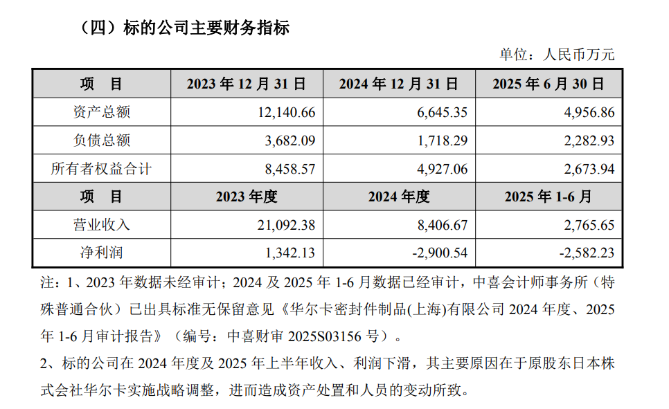 密封件公司成立于2000年,是业内少数具备高端工业波纹管制造能力的企业之一。“沃特新材料”消息称,密封件公司专注于高性能密封件、波纹管及氟树脂制品的研发、制造与销售,产品广泛应用于半导体设备(如刻蚀机)及核能等高端制造领域。本次收购完成后,沃特将整合华尔卡密封件在高端密封制品方面的技术及客户资源,将有望打造全球第一氟材料制品平台,并形成行业内最完整的半导体部件解决方案(沃特旗下已拥有浙江科赛、沃特华本两大半导体氟材料制造基地,PTFE材料产能位居行业第一)。但密封件公司的财务指标却显示,其2023年度、2024年度和2025年1-6月营收分别为2.11亿元、0.84亿元和0.28亿元,净利润分别为0.13亿元、-0.29亿元和-0.26亿元,这或许对沃特股份整合之路带来一定挑战。