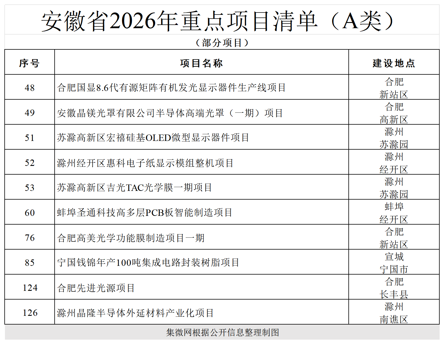 A类项目包括:合肥国显8.6代有源矩阵有机发光显示器件生产线项目,安徽晶镁光罩有限公司半导体高端光罩(一期)项目,苏滁高新区宏禧硅基OLED微型显示器件项目,滁州晶隆半导体外延材料产业化项目等;