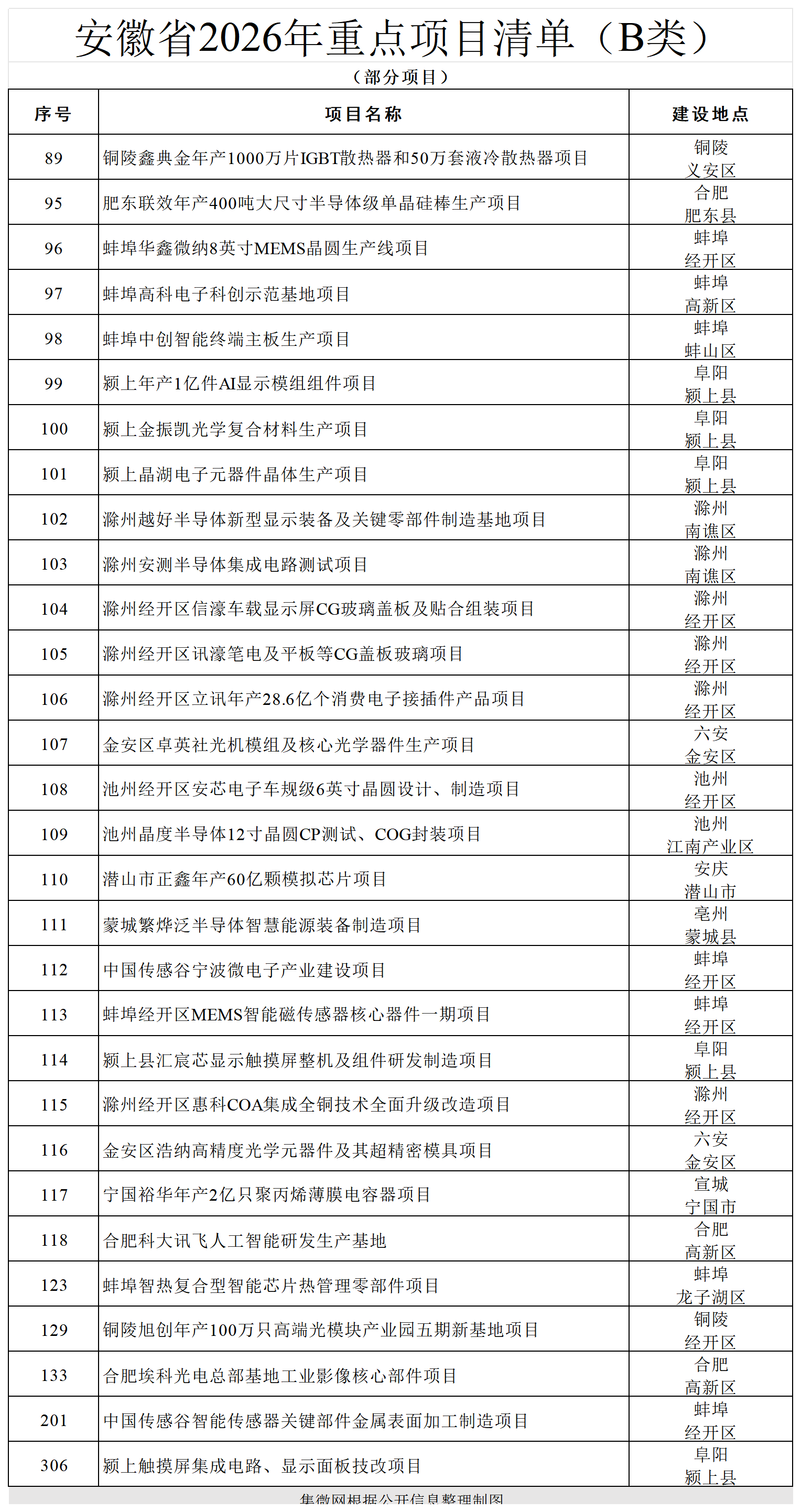 B类项目包括:蚌埠华鑫微纳8英寸MEMS晶圆生产线项目,滁州安测半导体集成电路测试项目,池州经开区安芯电子车规级6英寸晶圆设计,制造项目,池州晶度半导体12寸晶圆CP测试、COG封装项目,宁国裕华年产2亿只聚丙烯薄膜电容器项目等。