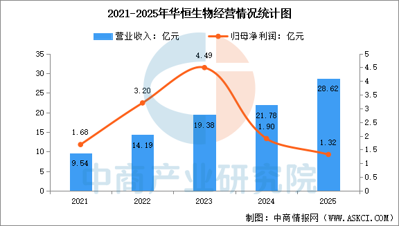 2025年,华恒生物实现营业总收入28.62亿元,同比增长31.40%,归母净利润1.32亿,同比下降30.13%。分产品来看,2025年,公司氨基酸系列产品收入占比71.95%,维生素系列产品收入占比5.04%。