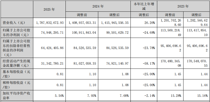 4月3日,豪恩汽电发布2025年年度报告。报告显示,公司全年实现营业收入17.88亿元,同比增长26.26%;归属于上市公司股东的净利润为7494.83万元,同比下降24.68%;扣非净利润为6442.44万元,同比下降23.78%。