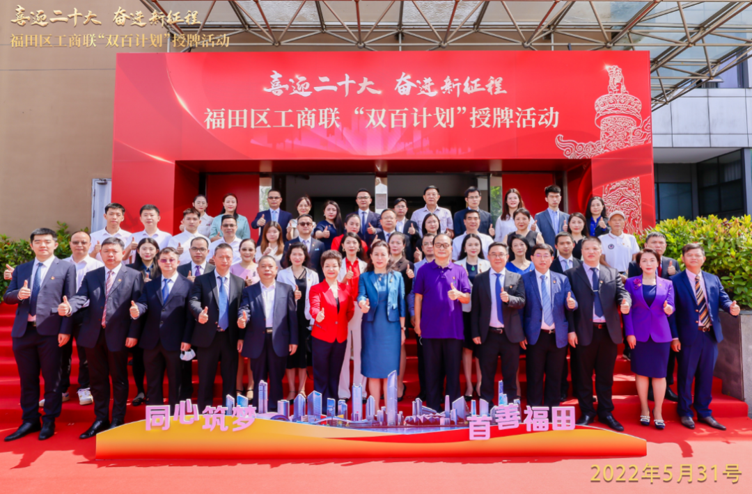 5月31日上午,商会应邀出席福田区工商联“双百计划”授牌活动,受颁“理想信念教育指导点”“关心下一代工作委员会”牌匾。