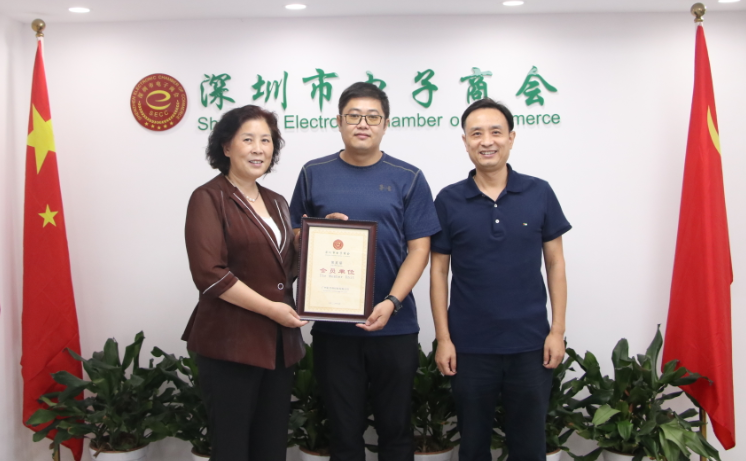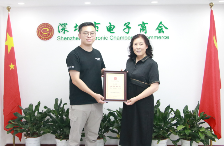 7月25日下午,徐慧英秘书长为新晋会员企业深圳市开步电子有限公司授会员牌,市场部经理李斐盈代表开步电子参与授牌仪式。
