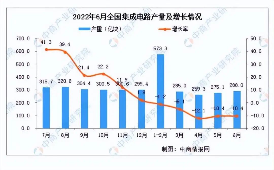 但是到了2022年后,形势有点不乐观了,因为2022年上半年,我们的集成电路产量仅为1660.8亿块,同比下降6.3%。