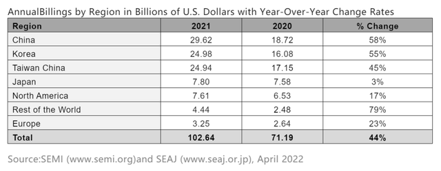 根据《全球半导体设备市场统计报告》统计,中国大陆在2021年的半导体设备销售额是296 亿美元,同比增长58%。