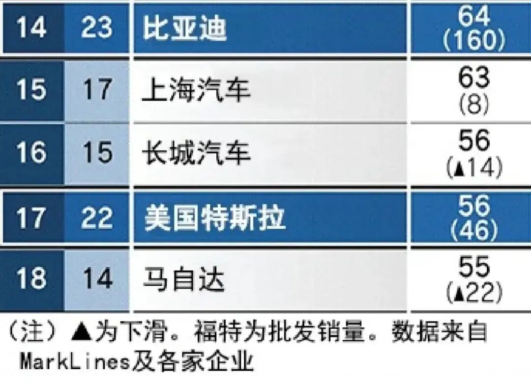不说新能源,我们就说全球所有车企,包括燃油车车企,比亚迪也表现不俗,以64.14万辆,排在全球第14名。相比于去年的第23名,上升了9个名次。