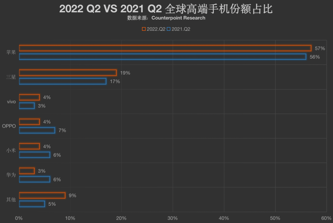 那么2022年,这些厂商们表现如何?近日Counterpoint Research 发布了二季度全球高端智能手机市场的数据,让我们一看究竟。