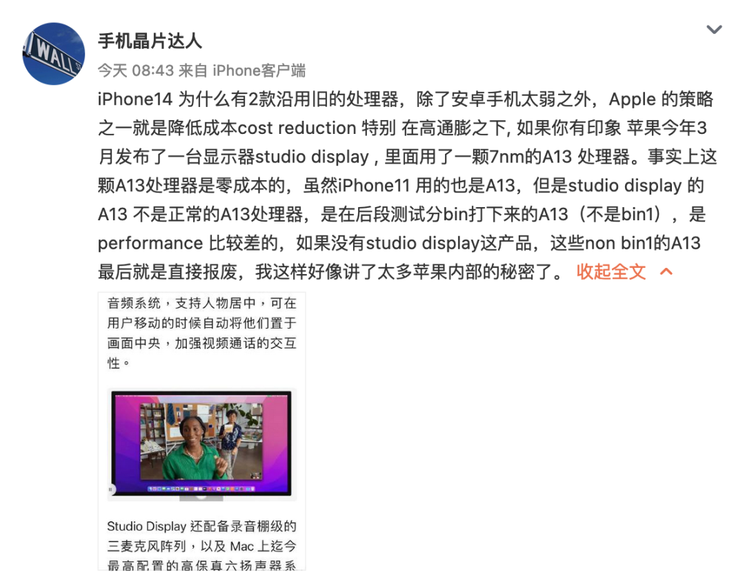 他提到了苹果Studio Display显示器,Studio Display搭载了iPhone 11系列同款A13芯片,他指出,Studio Display的A13不是正常的A13处理器,是在后段测试分bin打下来的A13(不是bin1),性能比较差,如果没有Studio Display,这些non bin1的A13最后就是直接报废。
