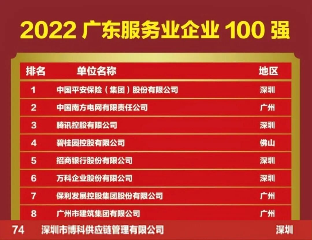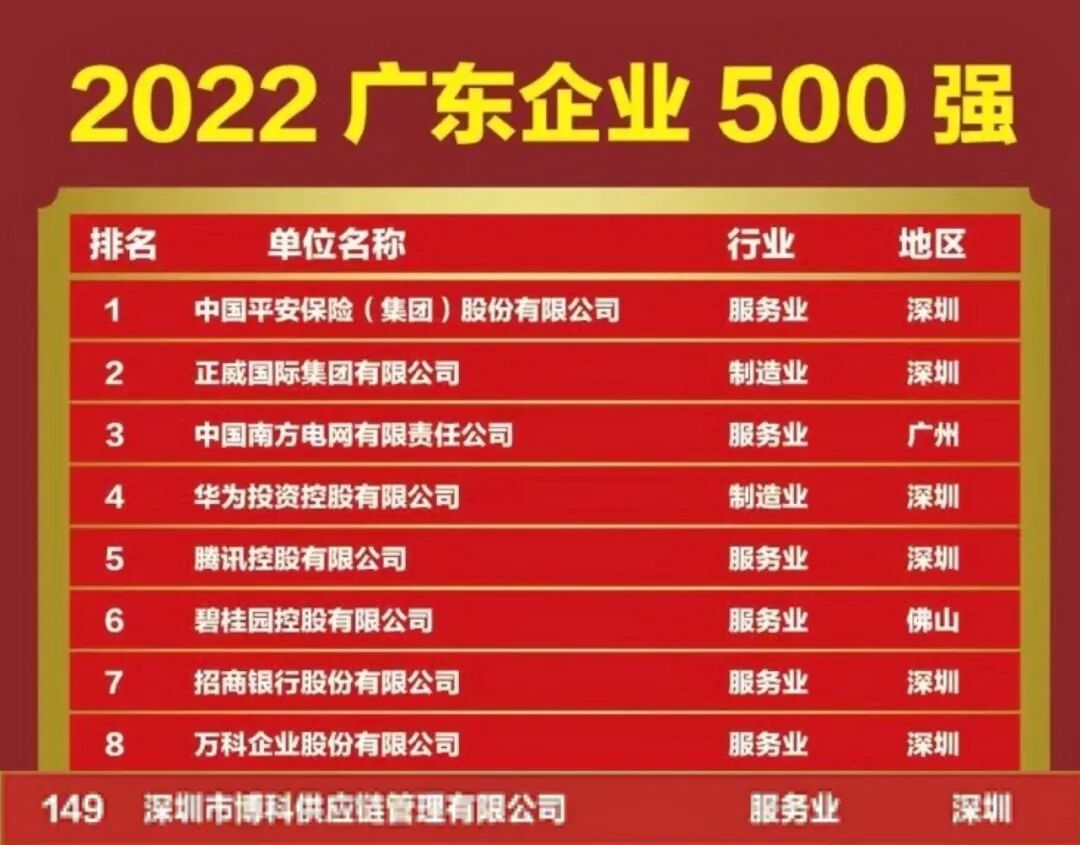 荣誉榜刷新!博科供应链再登2022广东百强榜单