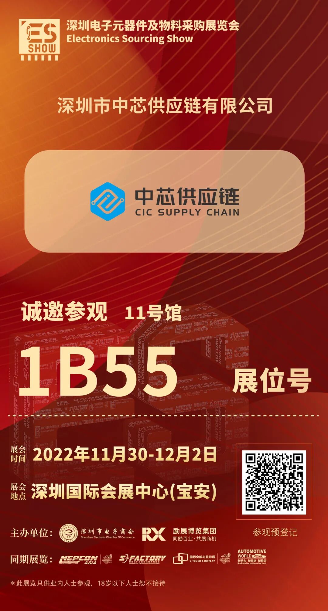 2022 深圳电子元器件及物料采购展览会,将于11月30日-12月2日在深圳国际会展中心(宝安)闪亮登场,隆重开幕。深圳市中芯供应链有限公司期待您的到来,11号馆1B55 展位,赶紧收下此邀请函,码上登记,我们不见不散!