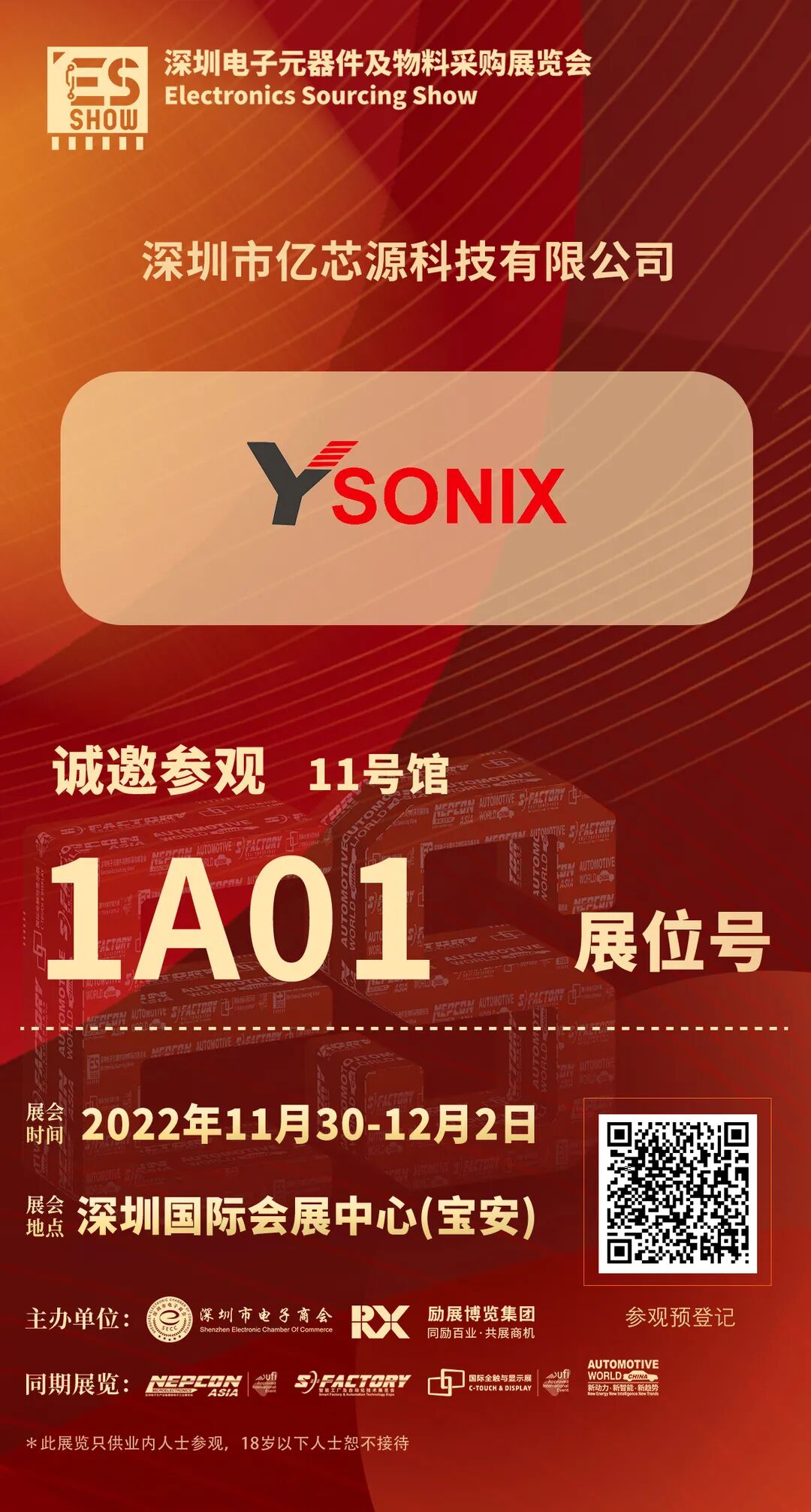 2022 深圳电子元器件及物料采购展览会,将于11月30日-12月2日在深圳国际会展中心(宝安)闪亮登场,隆重开幕。深圳市亿芯源科技有限公司期待您的到来,11号馆1A01展位,赶紧收下此邀请函,码上登记,我们不见不散!