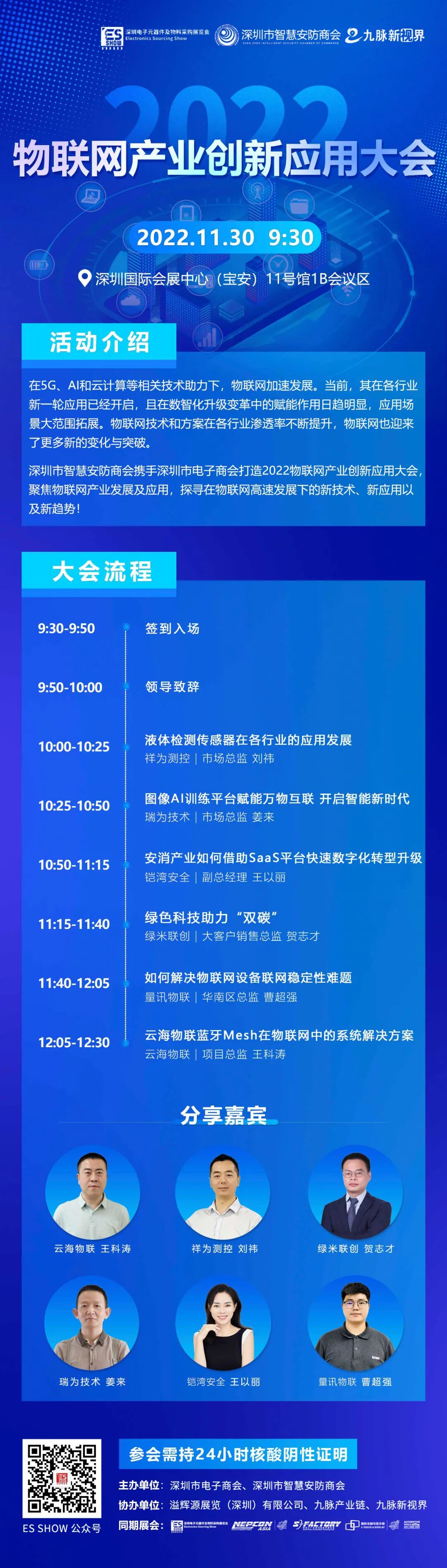江南娱乐APP网页版 联合深圳市智慧安防商会共同打造 2022物联网产业创新应用大会 将在2022年11月30日亮相 深圳电子元器件及物料采购展览会11号馆,展会将在2022年11月30-12月2日在深圳国际会展中心(宝安新馆)举办,届时聚焦物联网产业发展及应用,探寻在物联网高速发展下的新技术、新应用以及新趋势!!