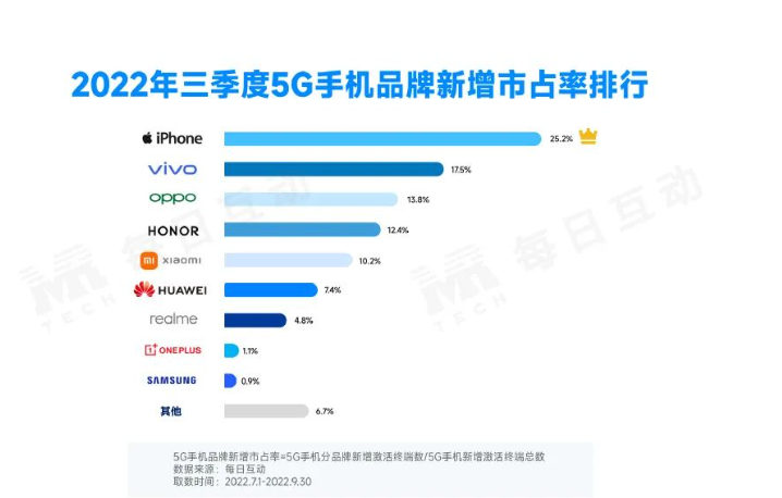 再看2022年3季度,新增5G手机品牌占比情况,大家看到苹果是以25.2%的比例,遥遥领先于其它品牌,又拿下了一个中国第一名。