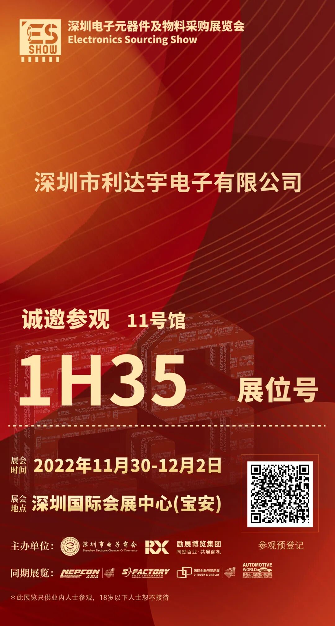 2022 深圳电子元器件及物料采购展览会,将于11月30日-12月2日在深圳国际会展中心(宝安)闪亮登场,隆重开幕。深圳市利达宇电子有限公司期待您的到来,11号馆1H35展位,赶紧收下此邀请函,码上登记,我们不见不散!