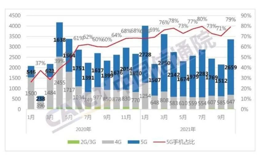 但按照信通院昨天发布的数据,到10月份,国内5G手机销量占比达到了79%左右,也意味着4G手机,其实已经只有20%的市场了。