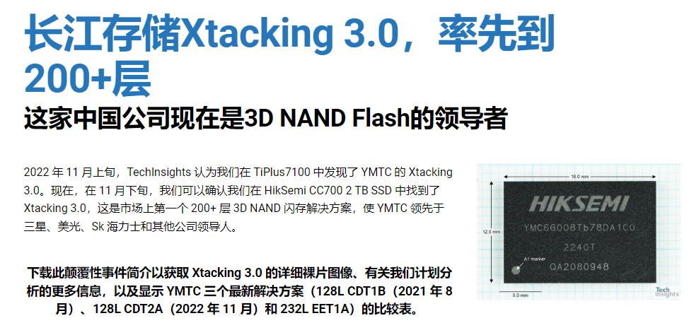 但是长江存储的232层NAND闪存,却已经大规模量产,用于实际的SSD产品中了。据 TechInsights 的说法,他们拆解了海康威视的 CC700 2TB 的固态硬盘,发现其中使用的就是长江存储的 232 层的 3D NAND闪存,这可是全球第一个,是领先于美光、三星、SK海力士等巨头的。