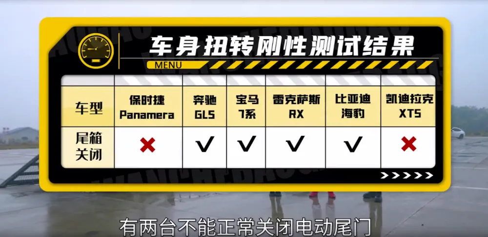 从媒体的对比测试结果来看,保时捷Panamara、奔驰GLS、宝马7系、雷克萨斯RX、凯迪拉克XT5以及比亚迪海豹这6款车型中,保时捷Panamara和凯迪拉克XT5居然没能通过测试。