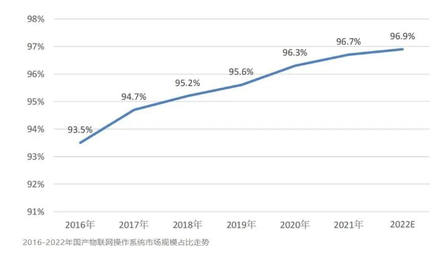 如上图所示,这是某机构统计的国内物联网操作系统的市场占比图,2016年时就超过93.5%,到2022年时达到了96.9%,基本上是处于统治地位的,国外的物联网系统根本就不是对手。