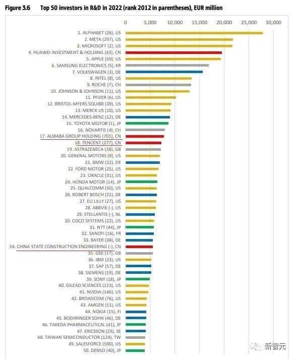 而在全球研发投入前50的企业中,阿里巴巴、腾讯和中国建筑也位列其中。值得注意的是,阿里的排名从十年前的700名跃升至第17名;腾讯也从第277名荣升至第18名。