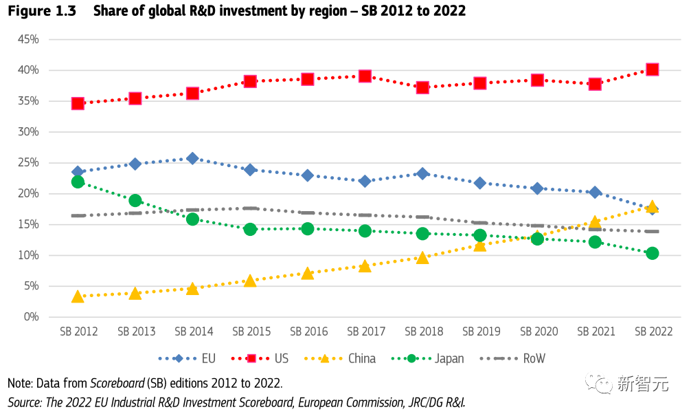 根据各国家自2012年以来研发份额变化的趋势,中美两国均稳步上升,欧盟和日本的研发投资份额逐步下降。欧盟在报告中称,要「采取更大努力,弥补和中美两国在研发投入方面的差距。」