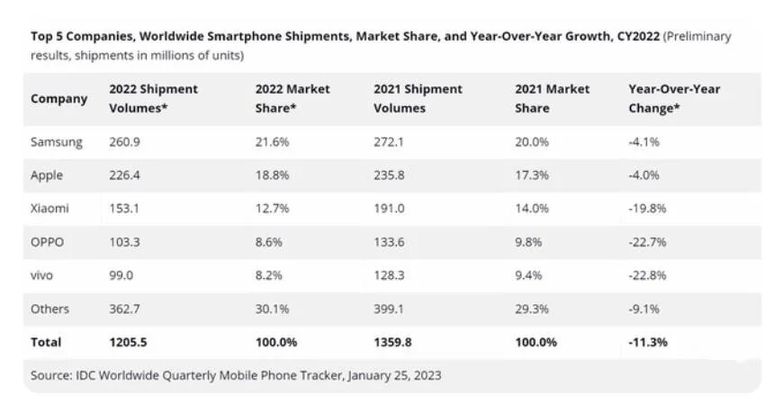 日前,IDC公布了2022年全球手机市场年度报告,数据显示,三星手机在2022年全球总销量为2.6亿部,在第一梯队的五大头部品牌中继续领先苹果、小米、OPPO、vivo,稳居全球第一。