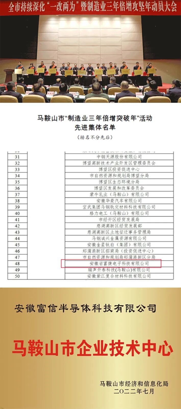 1月29日,理事单位安徽省富捷电子科技有限公司(简称“富捷电子”)荣获“制造业三年倍增先进集体”荣誉;近期,富捷电子还被安徽省马鞍山市工业和信息化局授予“企业技术中心”称号。