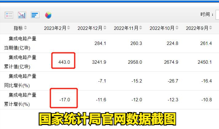 截止至2023年2月份,国内集成电路生产总量为443亿块,下滑比例为17%。