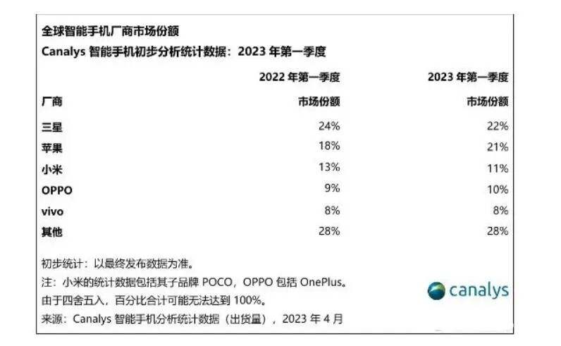 近日,知名机构Canalys 发布了 2023 年第一季度的全球智能手机市场报告。