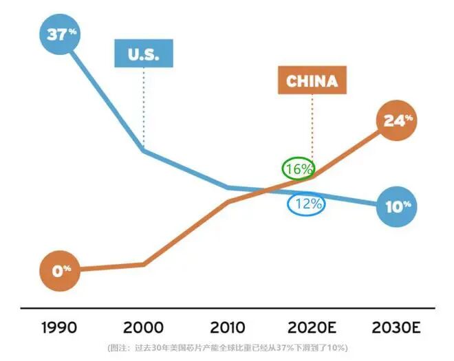 所以我们看到,中国大陆的芯片产业,一直在增长,在2020年时就超过了美国达到了16%,而美国的芯片产能一直在下降,到2020年时降至了12%。