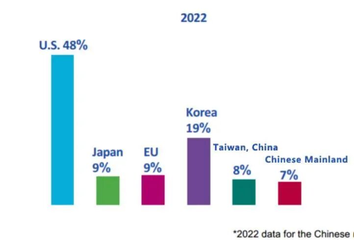 别以为48%不算高,我们对比一下其它国家和地区,就明白,这个48%有多牛了,如下图所示,第二名是韩国,份额仅为19%,不到美国一半。