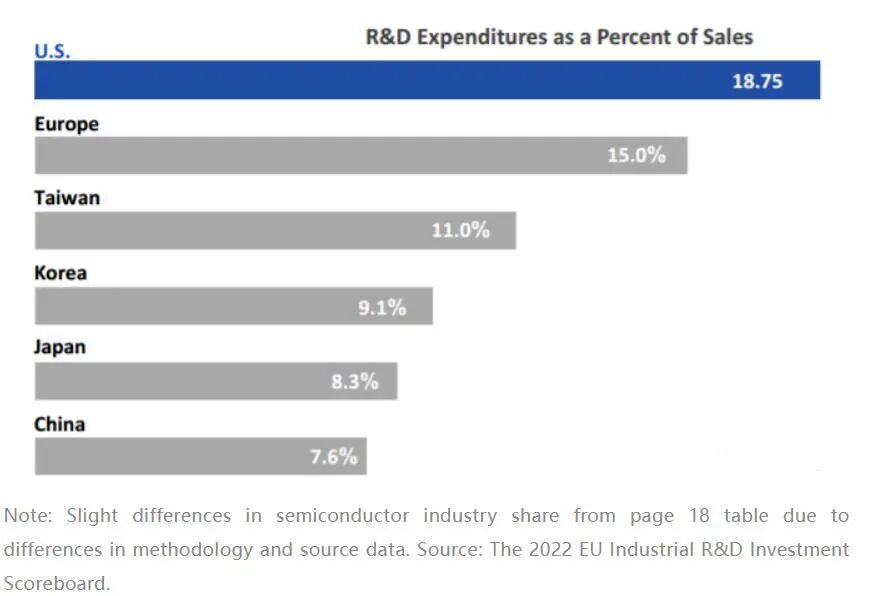 而按照2022年欧盟工业研发投资排行榜的数据,美国半导体行业的研发支出在总销售额当中占比高达18.75%,虽然低于上面计算出来的值,但也是全球第一。
