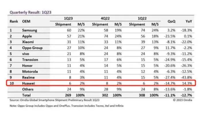 按照Omdia的数据,2023年一季度,华为手机的销量约为650万台,排在全球第10名,同比增长14.3%,环比下滑14.7%。