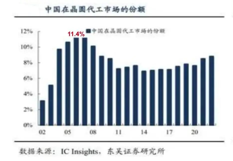而中国自从中芯国际创立之后,在芯片代工方面,也是突飞猛进,按照IC insights的数据,2006 年中国大陆芯片代工份额占全球的比例约为11.4%。