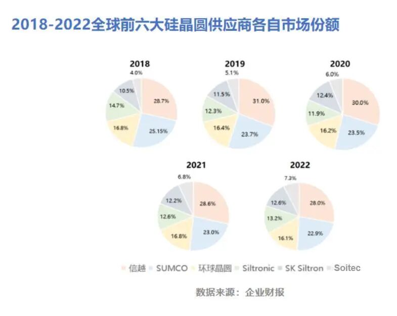 这6家厂商中,日本两家企业——信越和胜高,拥有硅晶圆市场50%+的份额,占据半壁江山。