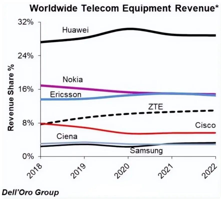 然后数据显示,从2018年到2022年,中兴的份额还一直在增长,和诺基亚、爱立信的差距越来越小,未来超过其中的一家也不是不可能。