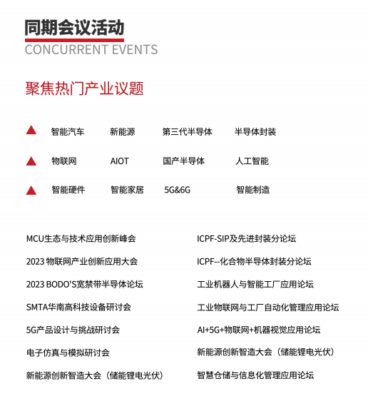 02 ES SHOW 2023 联合NEPCON ASIA亚洲电子生产设备暨电子工业展览会、智能工厂及自动化技术展览会、中国汽车工业技术展、深圳国际全触与显示系列展,展览总面积16万平方米,展商群体包含:电子元器件、汽车电子、电子生产设备、触控显示等上下游企业3000余家。 03 全新升级亮点展区:EMS电子制造服务专区、半导体封测产线展示区;整合各类新品、缔结贸易契机、打卡市场:集中展示半导体/IC、被动元件、集成电路、传感器等产品。 04 同期聚焦行业热点,举办超50场热门会议活动。“2023 Bodo’s宽禁带半导体峰会”、“2023 MCU技术及智能家居应用”、“2023 物联网产业创新应用大会”、“ICPF-SiP及先进封装分论坛”、“ICPF--化合物半导体封装分论坛”、“汽车电子采配对接会 ”等主题论坛覆盖电子产业,汇聚了行业内的领袖,畅谈产业发展,市场趋势、技术应用等热点。 *活动内容以现场为准,主办方拥有活动最终解释权! 05 快来扫描下方二维码提前预登记参观ES SHOW 2023,免排队入场快人一步! 温馨提示:观众参观展会时需打印电子胸卡,并携带本人身份证入场。此活动只供业内人士参观,18岁以下人士忽不接待。 2023.10.11-13 深圳国际会展中心 ESSHOW 组团请联络: For visitor enquiry, please contact: 陈倩怡 女士,Ms. Stephenie Chan 电话:0755-83796797 邮箱:Stephenie_chan@esshow.cn