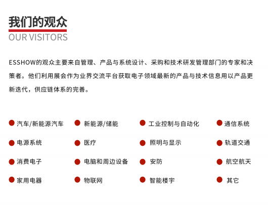 ES SHOW 2023 将与同期展会观众互通,邀请来自国内元器件、家电、通信、汽车、半导体、工控、新能源、触控显示、医疗、光电、LED、物联网、5G、AR/VR、照明与消费、消费电子、家电、安防等行业买家莅临,全面呈现从元件到系统、从设计到制造的全产业链面貌,共享同期超过10万名的专业观众。
