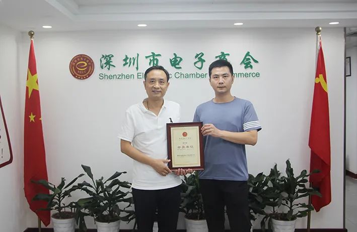 6月13日上午,新晋会员企业深圳市华普冠科电子科技有限公司陈鑫到访秘书处,朱宏凯副秘书长为陈总授会员牌。