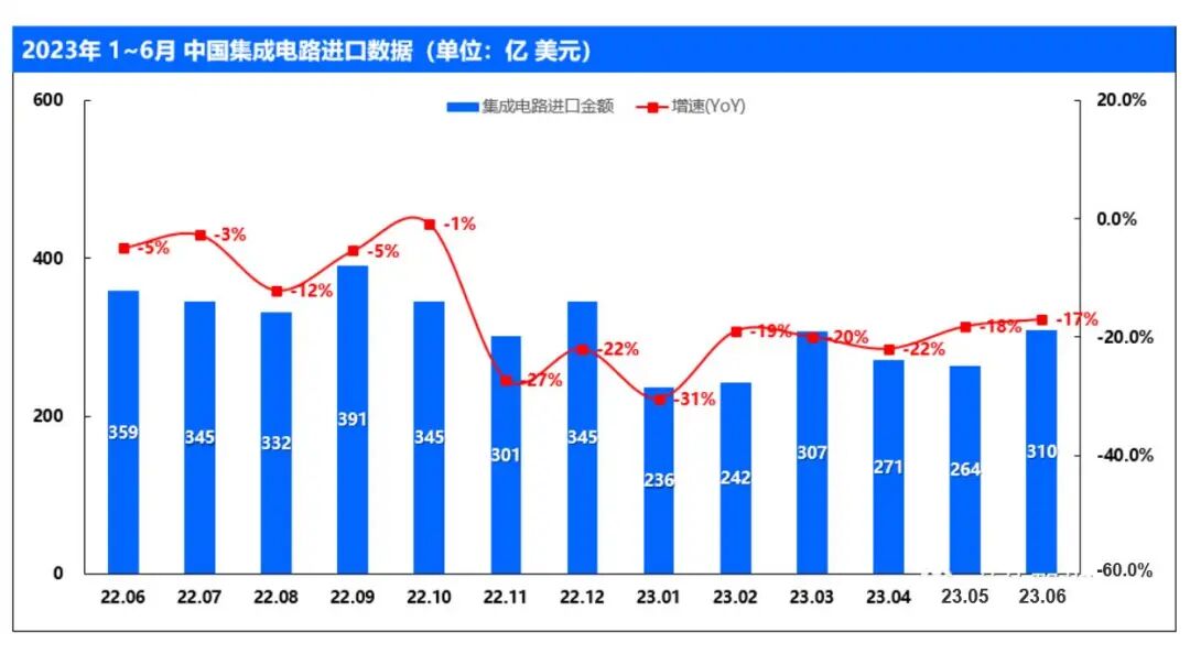 当然,数据还要对比着看,据海关的数据显示,2023年整个上半年,中国进口芯片2277亿颗,少进口了516亿颗,下降了18.5%。而进口金额为1630亿美元,少进口333亿美元(约2400亿元),下降17.0%。