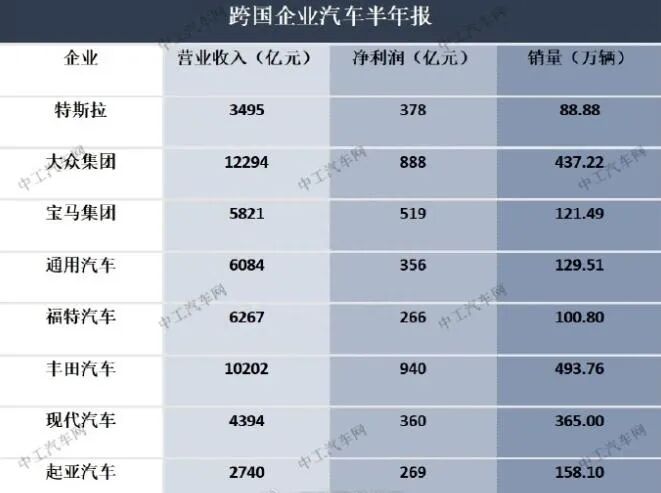 其中销量均是超过了300万台,而利润方面,丰田超过900亿,大众接近900亿,其它老牌企业,像现代、通用、宝马等,也都是超过300亿。