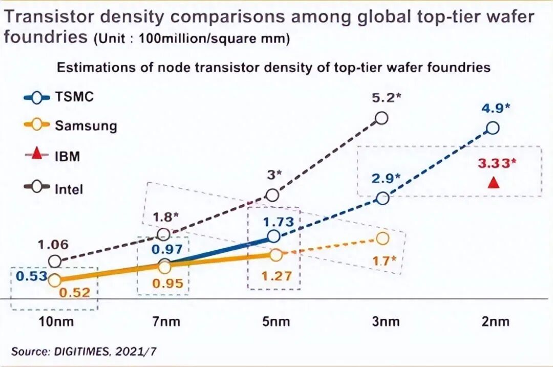 所以,目前很多专业人士,评价芯片工艺时,一般还会参考晶体管密度。因为芯片由晶体管组成,同样面积下,晶体管越多,密度越高,性能就越强。