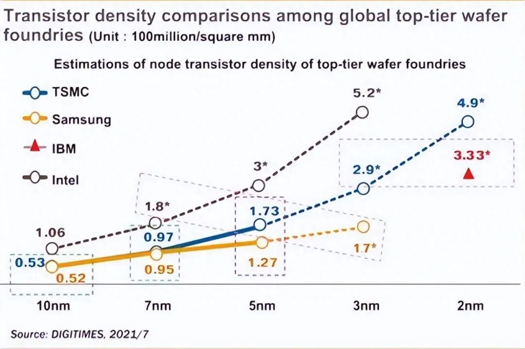 台积电、三星的7nm,等于英特尔的10nm。而台积电的5nm等于三星的3nm、intel的7nm。