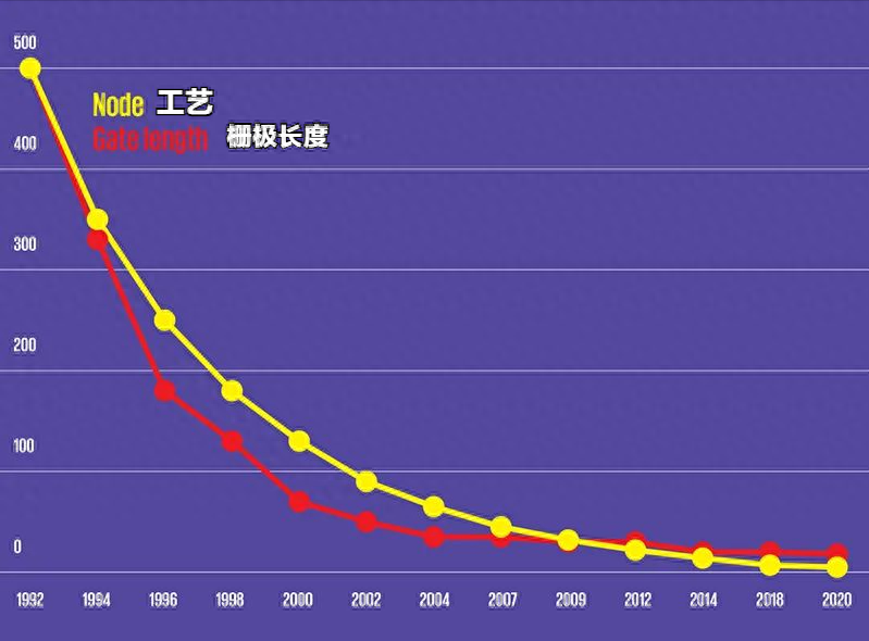 再后来,栅极长度又落后于工艺,因为工艺不断前进后,栅极长度无法不断的每一代缩小30%。
