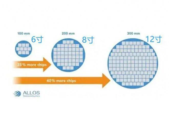 芯片的发展,是工艺越来越小,而晶圆的发展是尺寸越来越大,以前是4寸,再是6寸,再8寸,12寸。